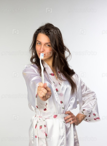 Женщина в пеньюаре с зубной щеткой