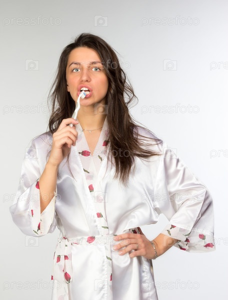 Женщина в пеньюаре с зубной щеткой