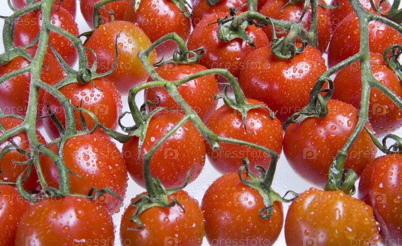 Помидоры на ветке в каплях воды