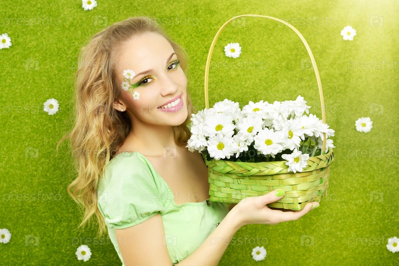 Улыбающаяся девушка с корзиной цветов