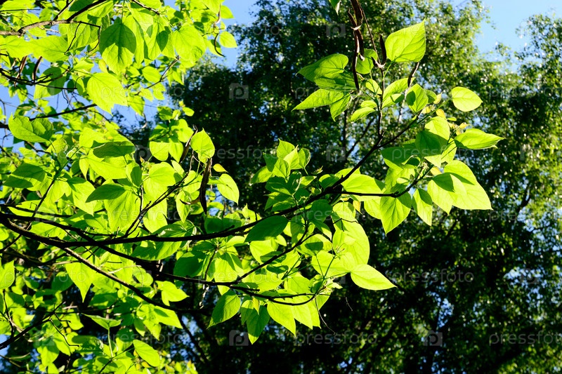 Катальпа бигнониевидная (Catalpa bignonioides) листья и плоды в крупном плане