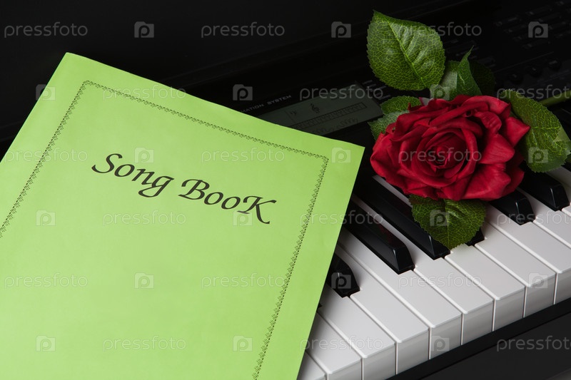 Клавиши пианино, песенник и цветок розы