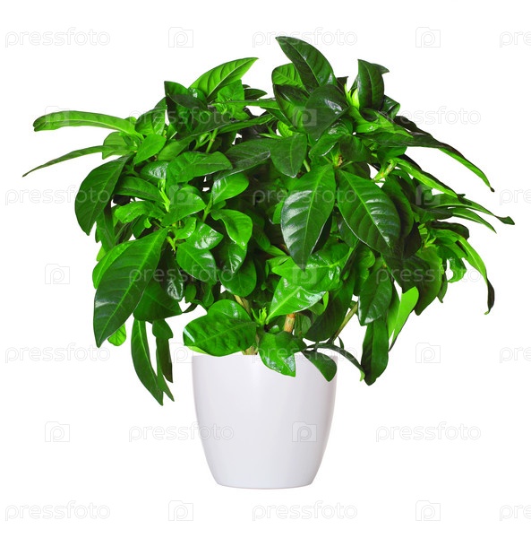 Росток гардении в горшке, изолированный на белом