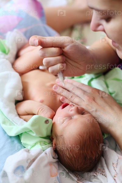 Мать кормит новорожденного ребенка молоком из шприца