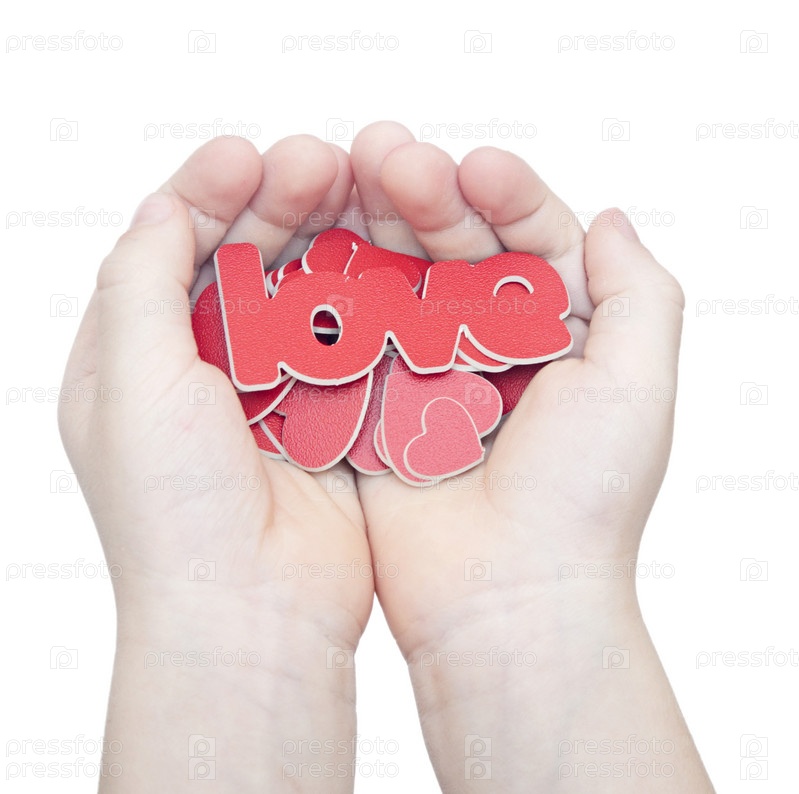 Руки держат слово «любовь» на белом фоне