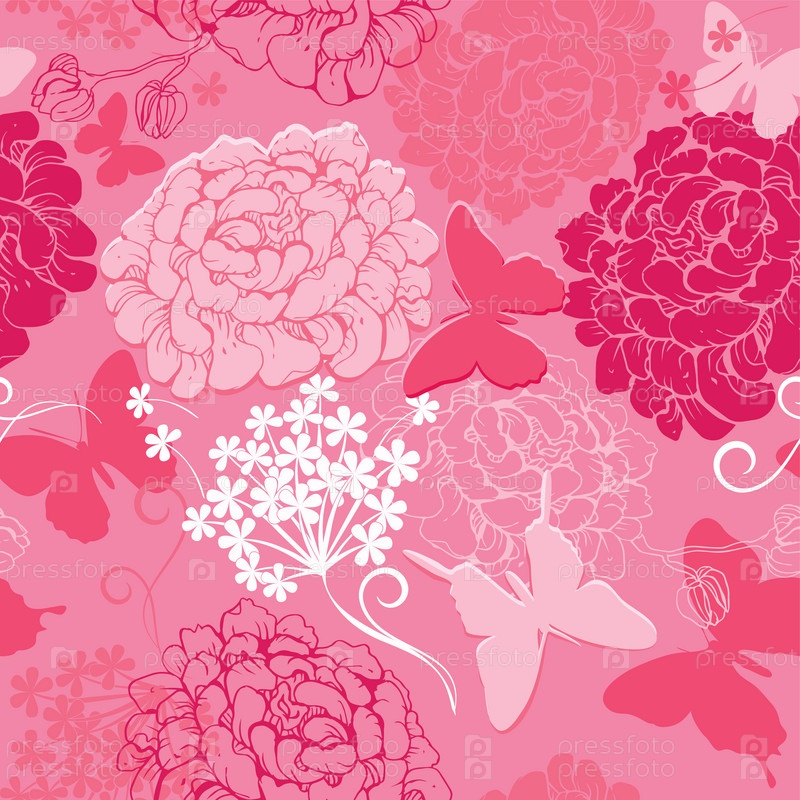Бесшовный розовый фон с силуэтами бабочек и цветами