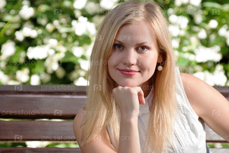 Привлекательная женщина на скамейке в весеннем парке