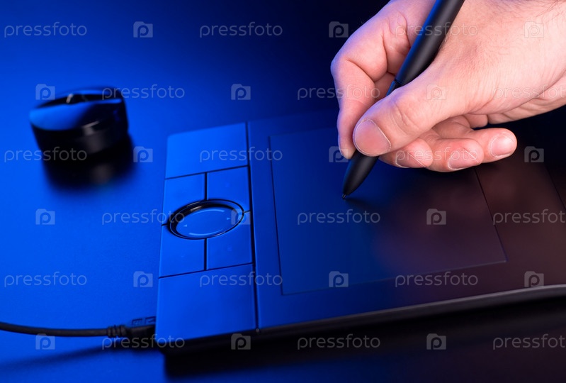 Рука человека рисует на графическом планшете в синем свете