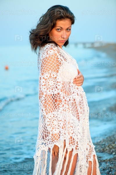 Молодая женщина в белом парео у моря