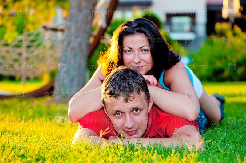 Влюбленная пара лежит на зеленой лужайке