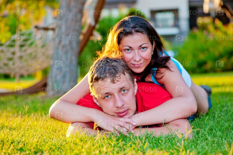 Влюбленная пара лежит на зеленой лужайке