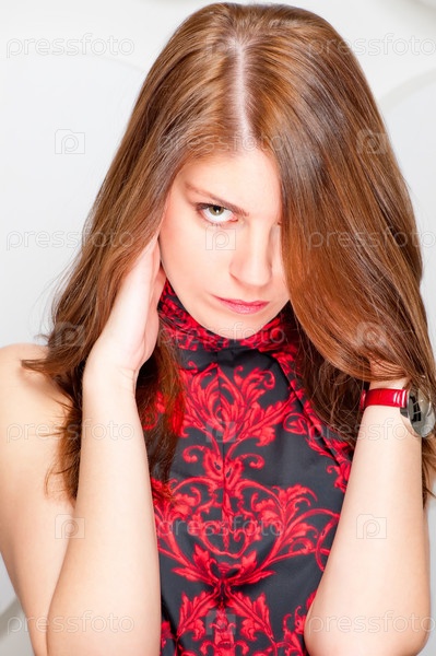 Красивая девушка в красном платье в студии
