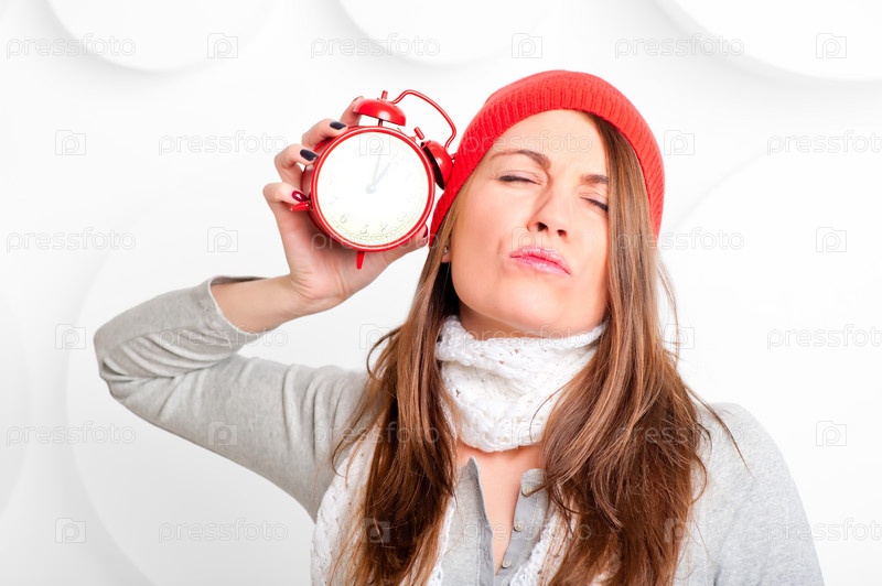 Девушка в шапке и шарфе с красным будильником