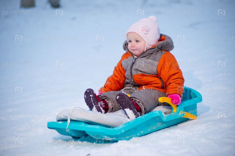 Ребенок катится на санках с горы