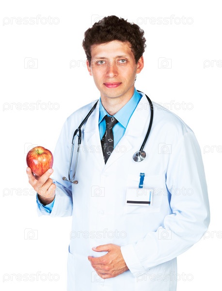 Портрет улыбающегося врача с красным яблоком н