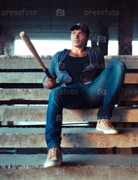 Мужчина с бейсбольной битой в руинах