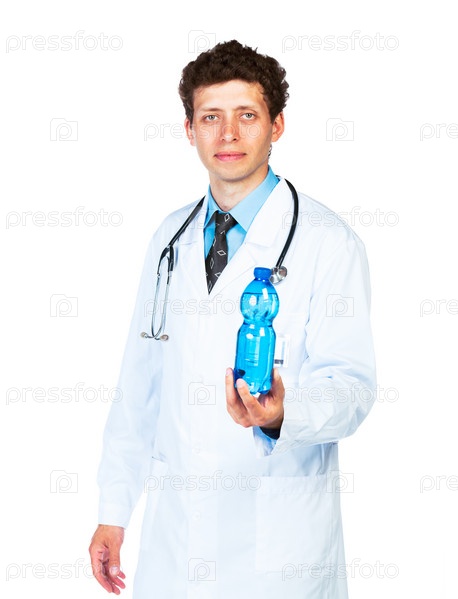 Врач держит бутылку воды на белом фоне