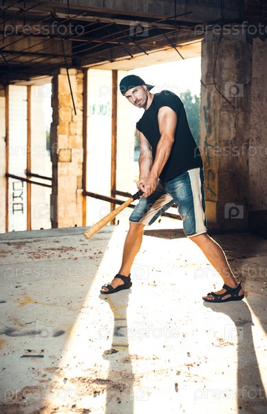 Мужчина с бейсбольной битой в руинах