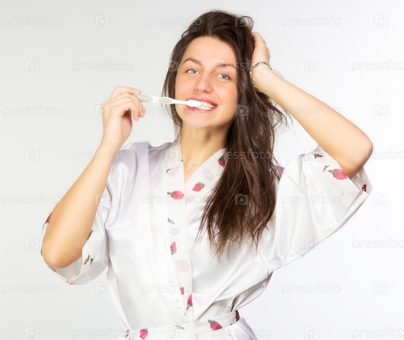 Женщина в пеньюаре с зубной щеткой