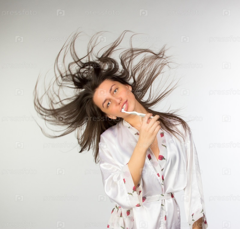 Женщина в пеньюаре с зубной щеткой