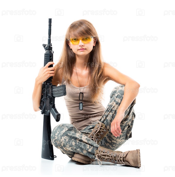 Девушка в камуфляже с автоматом в руке на белом фоне