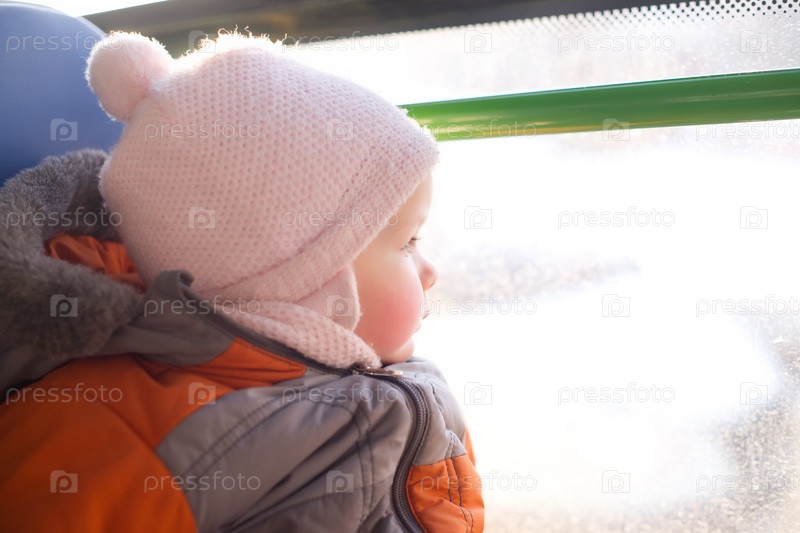 Ребенок едет в городском автобусе и смотрит в окно