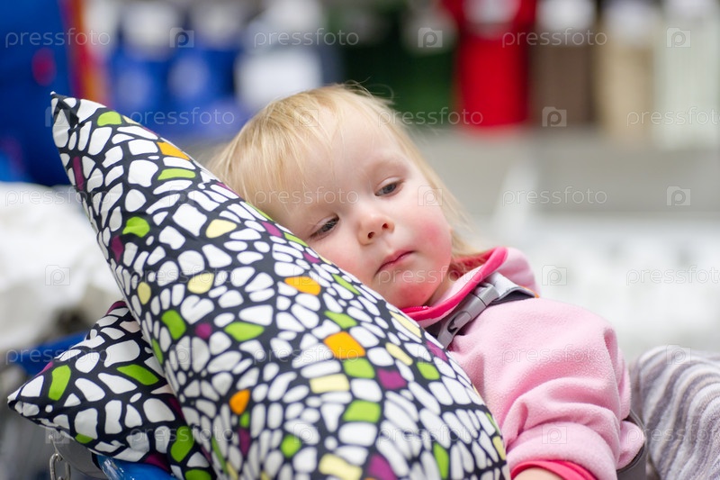 Маленький ребенок сидит в тележке с подушками в супермаркете