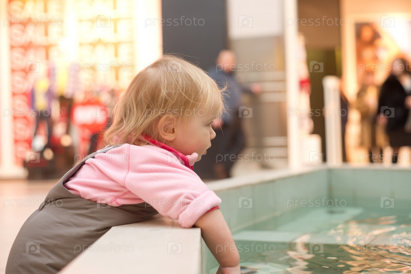 Маленький ребенок трогает водичку в фонтане супермаркета