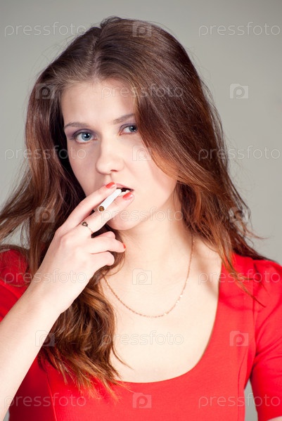 Портрет красивой брюнетки в красном платье с сигаретой в зубах