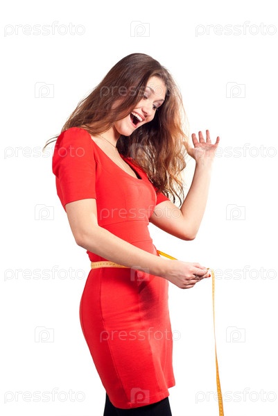 Девушка измеряет окружность талии сантиметровой лентой на белом фоне