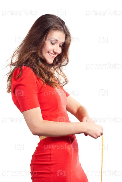 Девушка измеряет окружность талии сантиметровой лентой на белом фоне