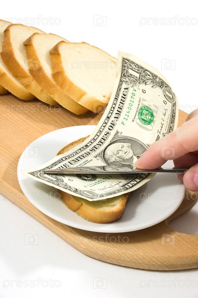 Рука разносит хлеб с тысячерублевой банкнотой на маленькой тарелке на режущей доске