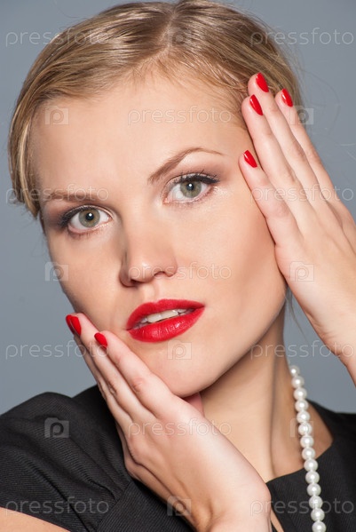 Портрет красивой молодой женщины с ярким макияжем и маникюром