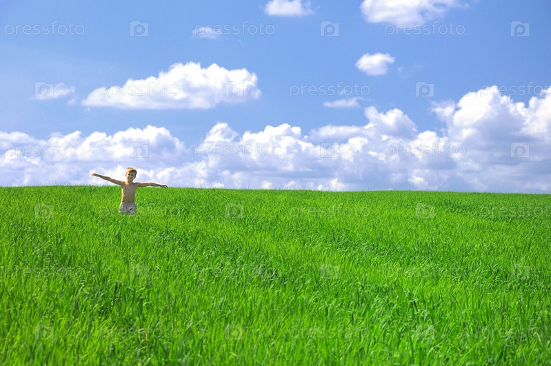 Мальчик бегает по зеленому полю
