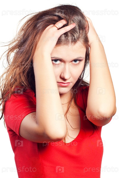 Красивая молодая женщина держится руками за голову на белом фоне