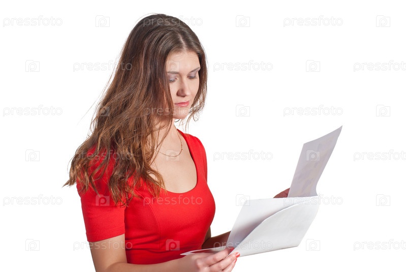 Красивая молодая женщина читает документы на белом фоне