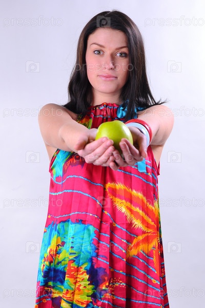 Портрет молодой женщины с яблоком в руках на светлом фоне