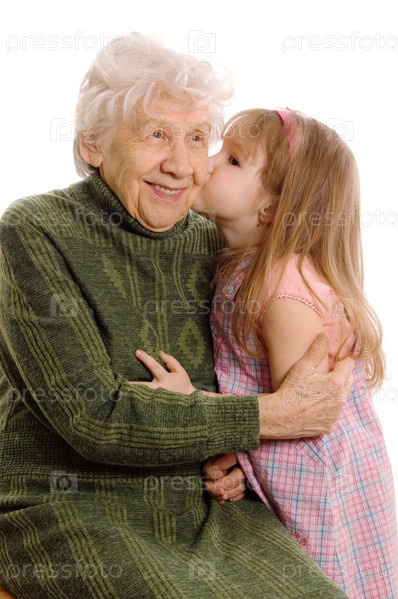 Счастливая пожилая женщина с внучкой на белом фоне