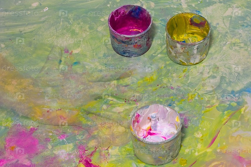 Консервы с краской для рисования пальцами и иллюзорной рукой ребенка на окрашенном пятнистом фоне