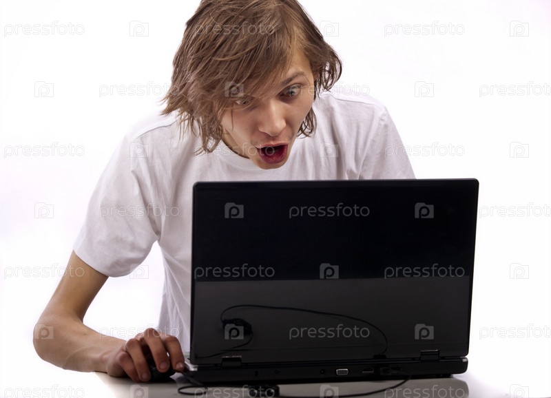Сумасшедший молодой человек за ноутбуком на белом фоне