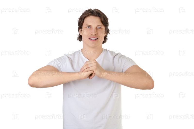 Молодой человек делает упражнения на белом фоне