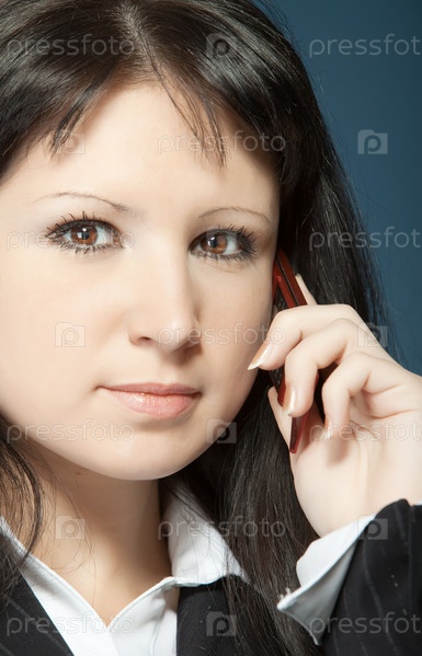Портрет бизнес-леди, разговаривающей по телефону на сером фоне