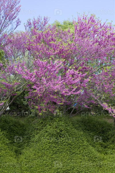 Куст с розовыми цветами на зеленом холме