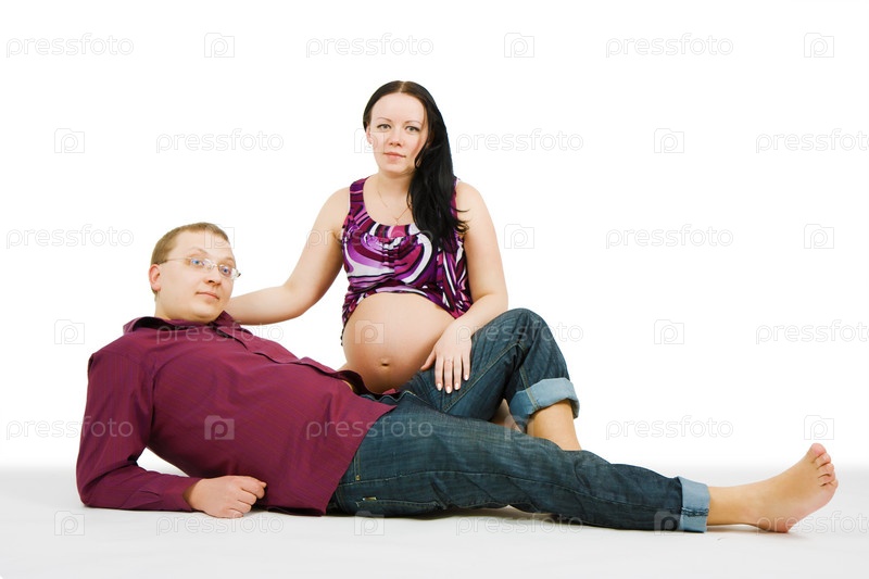 Молодой мужчина и молодая беременная женщина на белом фоне
