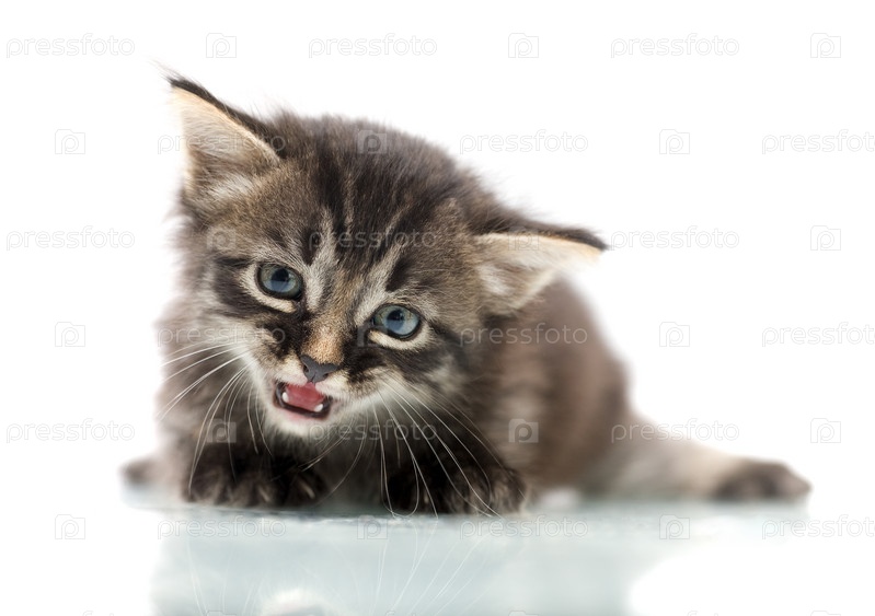Маленький милый котенок с голубыми глазами лежит, изолированный на белом