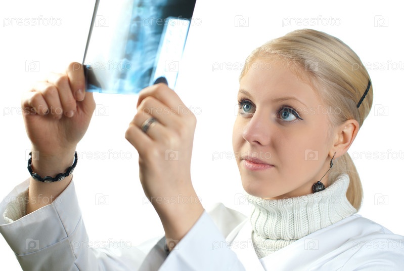 Молодая врач с рентгеновским снимком на белом фоне