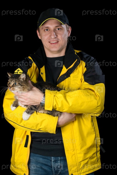 Мужчина с кошкой на черном фоне