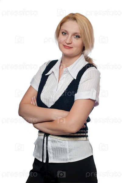 Привлекательная женщина стоит, скрестив руки. Изолирована на белом фоне