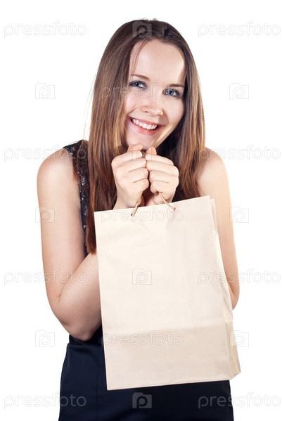Женщина с бумажным пакетом. Изолирована на белом фоне