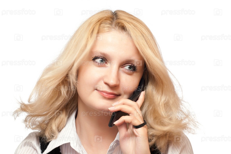 Романтическая женщина с мобильным телефоном. Изолирована на белом фоне